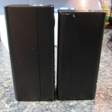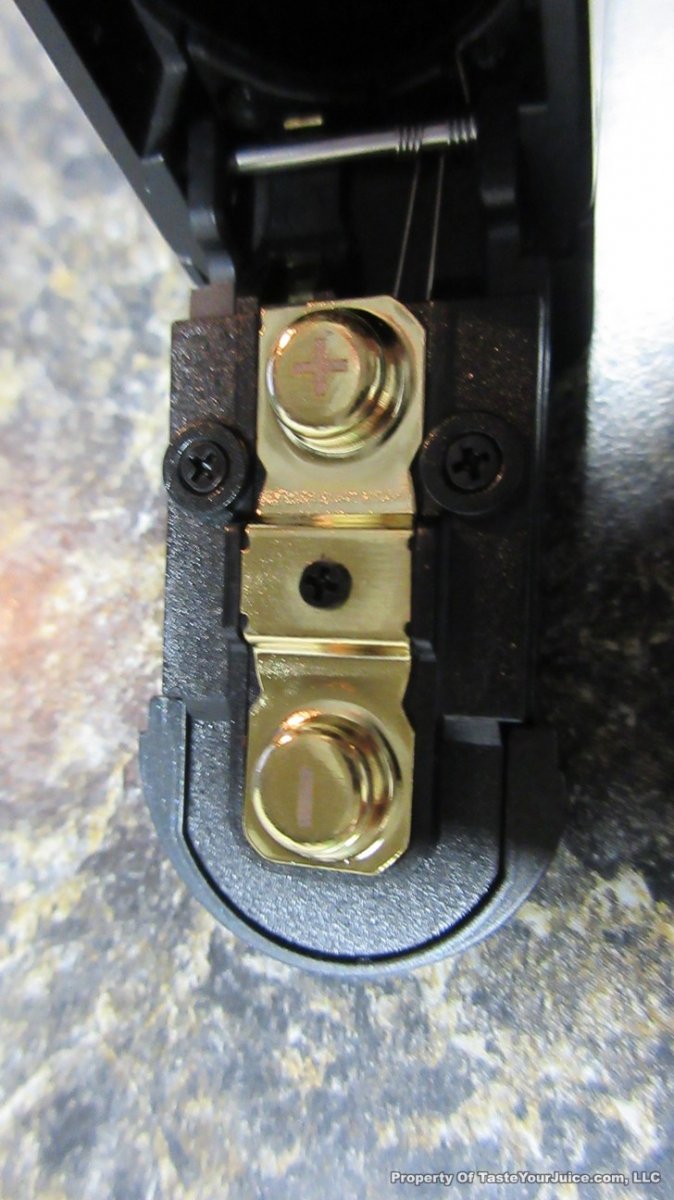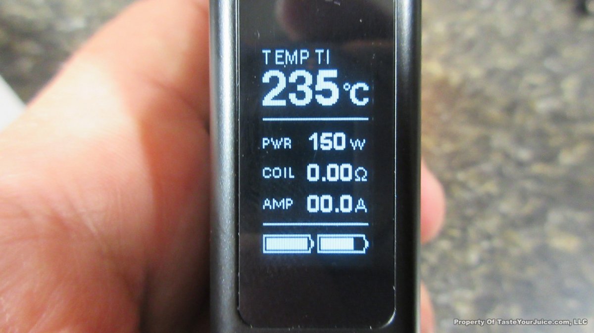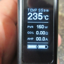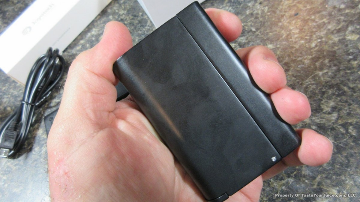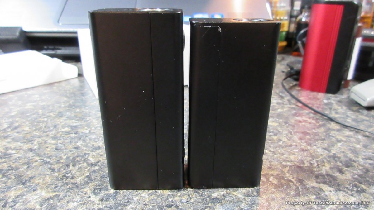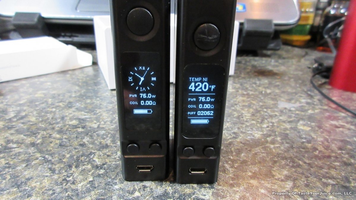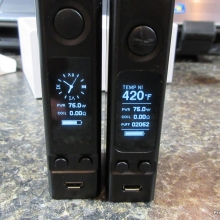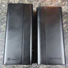 With this one, you can remove the control head, much like the Innokin Disrupter. You then have a choice of two battery holders which will change the size and wattage capability of the device. Use the single 18650 battery holder and you get a slightly larger eVic VTC Mini (see photos – the Dual is on the left) with a max of 75W. Use the dual 18650 battery holder which will give you a much larger device and the 150W… kinda like a “squished” Cuboid.