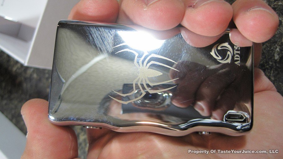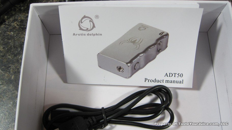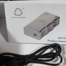 The ADT 50W is a box mod that designed by Arctic Dolphin, in zinc-alloy with gloss finish. The PCB is made by themselves with USA imported chip and parts. The unique thing about the ADT 50 chip is that it allows you to set the temperature that is the highest you want to vape on, it means that you will never burn your coil when the juice is low. Also it is the only one on the market currently that will automatically check temperature 1000 times/sec to keep it accurate and prevent the coil short-circuited. It is capable of running coils between 0.06ohm to 2.5ohm, uses a separate 18650 battery (not included), charged via the included micro-USB (passthrough, can be used while charging), has a spring-loaded pin and protection against short circuit and wont fire if battery is inserted the wrong way. The display shows ohms, watts, volts and set maximum temperature.