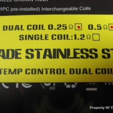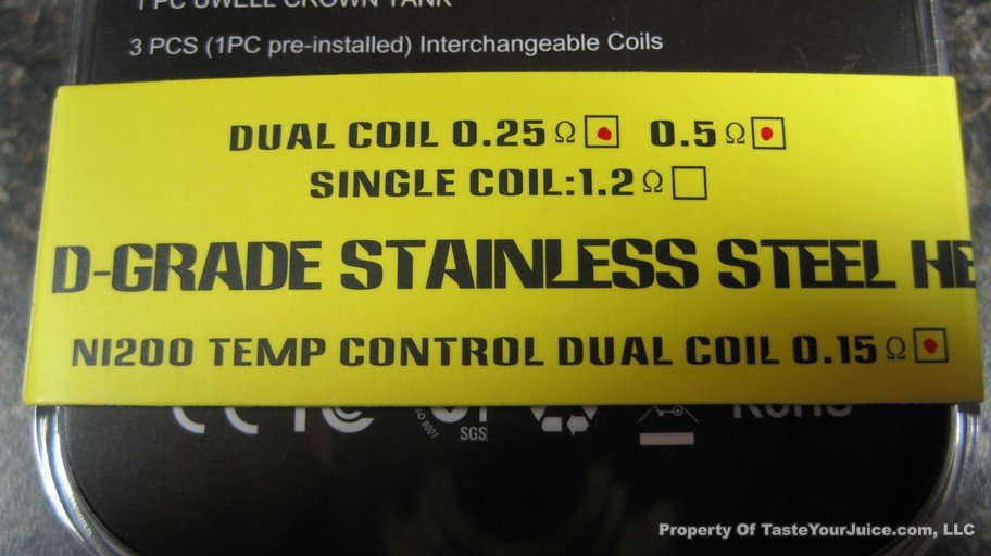 - Mine came with a spare tank section, .25 ohm dual coil SS head, .5 ohm dual coil SS head, .15 NI200 head.